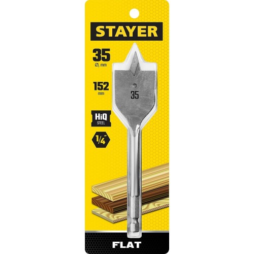 Сверло по дереву перовое STAYER 2950-35_z01, предназначено для работы с древесиной, а также легкими строительными материалами, такими как гипсокартон. Шестигранный хвостовик с проточкой, диаметр сверла - 35 мм.