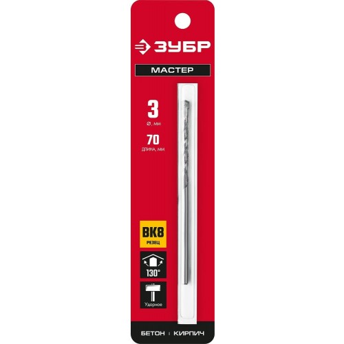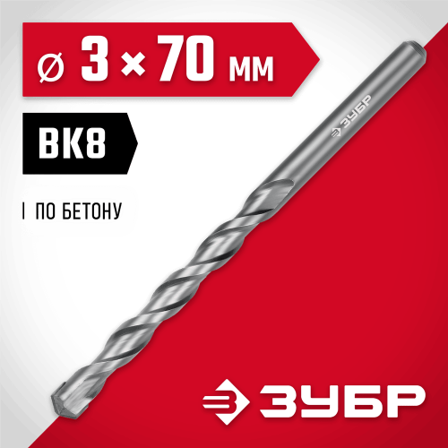 Сверло по бетону Зубр 2922-070-03, предназначено для работ по бетону, граниту, природному и искусственному камню, кирпичной кладке. Длина сверла: 70 мм. Тип наконечника: классический двухрезцовый. Материал наконечника: твердый сплав ВК8.