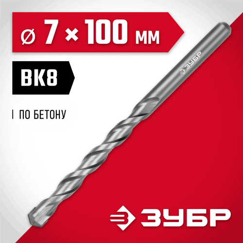 Сверло по бетону Зубр 2922-100-07, предназначено для работ по бетону, граниту, природному и искусственному камню, кирпичной кладке. Тип спирали: П-образная фрезерованная. Хвостовик: цилиндрический.