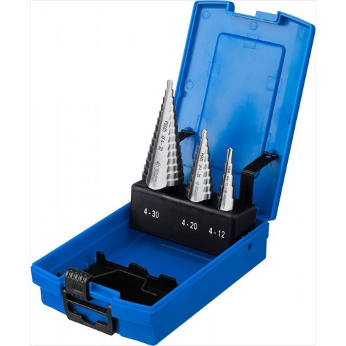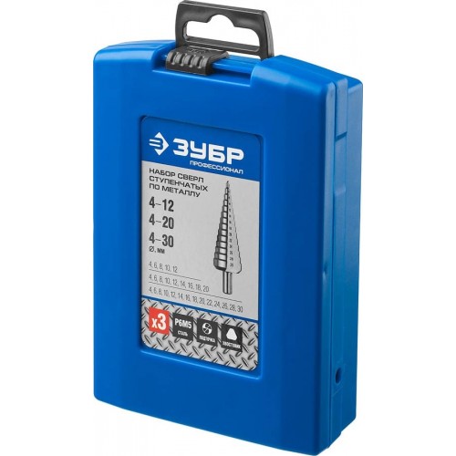 Ступенчатое сверло по металлу набор ЗУБР 29670-4-30-H3_z01, предназначено для сверления листового металла толщиной до 4 мм, цветных металлов, пластмасс и других материалов. Сверло изготовлено методом шлифования профиля по ГОСТ 10902-77 и соответствует классу точности сверления "А1". Угол заточки при вершине равный 135°, оснащенный крестообразной подточкой, позволяет сверлить тугоплавкие металлы и сплавы без предварительного кернения.