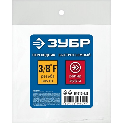 ЗУБР 3/8"F, рапид муфта (мама), переходник для пневмоинструмента 64910-3/8 Профессионал