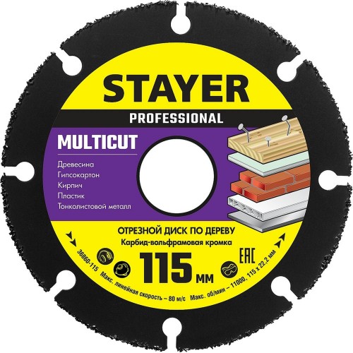 Отрезной диск для УШМ STAYER 36860-115, предназначен для грубых, быстрых распилов твердой и мягкой древесины, древесины с гвоздями и остатками цемента, фанеры, пластика, тонколистового и цветного металла, алюминиевого профиля, кирпича, а также гипсокартона.