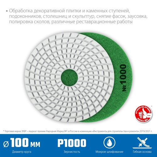 Алмазный гибкий шлифовальный круг (Черепашка) для мокрого шлифования ЗУБР 29866-1000, предназначен для шлифовки и полировки изделий из натурального и искуственного камня, керамогранита, гранита, мрамора с применением водяного охлаждения. Используется на ручном электроинструменте (УШМ, полировальные машины, дрели) с насадкой адаптером под липучку Velcro. Высокий ресурс и производительность благодаря оптимальному соотношению связки и фракции алмаза. Гибкая основа позволяет обрабатывать не только ровные плоскости, но и поверхности с плавными линиями изгибов. Система крепления Velcro (липучка) обеспечивает быструю замену круга. Широкая сфера применения: обработка каменных столешниц, подоконников, ступеней, скульптур, декоративной плитки, снятие фасок, заусовка, полировка сколов, различные реставрационные работы.
