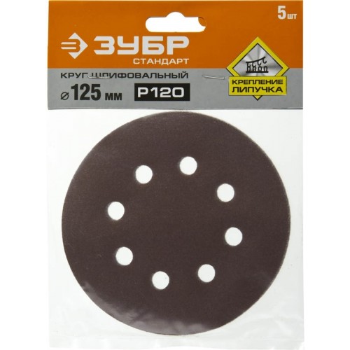 Круги шлифовальные на липучке из абразивной бумаги 125 мм, Р120 ЗУБР 35350-125-120, применяются на орбитальных шлифовальных машинках и электрических дрелях с опорной тарелкой для обработки дерева, металла, пластика и других материалов. Круги шлифовальные изготовлены из абразивной бумаги на современном оборудовании по оригинальной технологии вырубки и соединения с Велкро основой. Обладают высоким рабочим ресурсом. Отвечают всем требованиям экологической безопасности и не содержат вредных веществ и примесей.