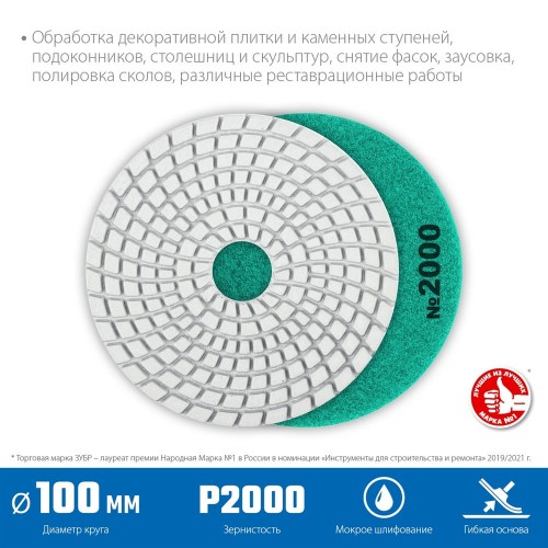 Алмазный гибкий шлифовальный круг (Черепашка) для мокрого шлифования ЗУБР 29866-2000, предназначен для предназначен для шлифовки и полировки изделий из натурального и искуственного камня, керамогранита, гранита, мрамора с применением водяного охлаждения. Используется на ручном электроинструменте (УШМ, полировальные машины, дрели) с насадкой адаптером под липучку Velcro. Высокий ресурс и производительность благодаря оптимальному соотношению связки и фракции алмаза. Гибкая основа позволяет обрабатывать не только ровные плоскости, но и поверхности с плавными линиями изгибов. Система крепления Velcro (липучка) обеспечивает быструю замену круга. Широкая сфера применения: обработка каменных столешниц, подоконников, ступеней, скульптур, декоративной плитки, снятие фасок, заусовка, полировка сколов, различные реставрационные работы.