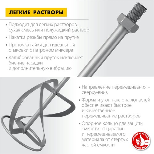 Насадка с лопастями для перемешивания легких растворов (краска, грунтовка, штукатурка, наливной пол, затирка). Используется совместно с ручными миксерами ЗУБР ЗМР-1200Э-1, МР-1050-1, МР-1100, МР-1400-2 и МР-1600-2.