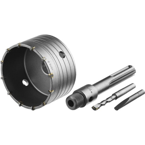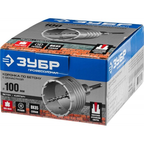 Буровая коронка ЗУБР 2918-100, предназначена для сверления отверстий в бетоне, кирпиче, природном и искусственном камне, а также плотных известняках. Используется с дрелями и перфораторами мощностью не менее 850 Вт в режиме ударного сверления. Твердосплавные зубья из сплава ВК85 позволяют эффективно дробить обрабатываемый материал. Специальная спиралевидная форма корпуса коронки из высокопрочной стали уменьшает трение о стенки отверстия, ускоряет отвод продуктов сверления и повышает срок службы инструмента. Коронка по бетону с полной оснасткой. Державка SDS-Max из легированной стали. Конусная посадка центрирующего сверла позволяет быстро демонтировать сверло в случае необходимости. Резьбовая посадка М22 обеспечивает надежное крепление коронки с державкой. Износостойкое покрытие защищает от коррозии.