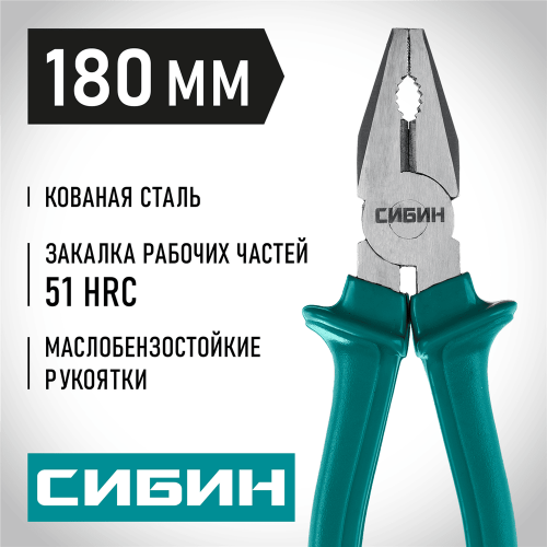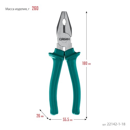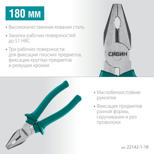Плоскогубцы СИБИН 22142-1-18, предназначены для выполнения слесарных, монтажных и ремонтных работ, широко используются в промышленности, транспорте, автосервисах и в личных гаражах и мастерских для захвата и удерживания мелких предметов, перекусывания проволоки. Изготовлены из высококачественной кованой стали. Имеют маслобензостойкие рукоятки.