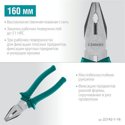 Плоскогубцы СИБИН 22142-1-16, предназначены для выполнения слесарных, монтажных и ремонтных работ, широко используются в промышленности, транспорте, автосервисах и в личных гаражах и мастерских для захвата и удерживания мелких предметов, перекусывания проволоки. Изготовлены из высококачественной кованой стали. Имеют маслобензостойкие рукоятки.