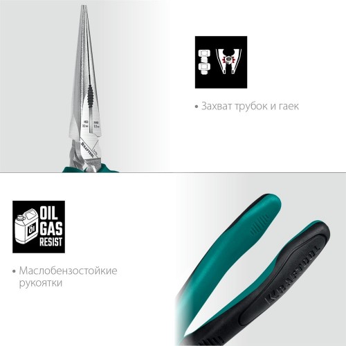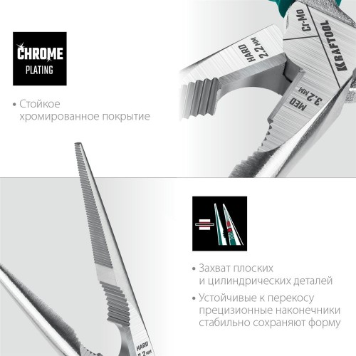 Тонкогубцы KRAFTOOL 22011-3-20_z01, предназначены для выполнения сложных слесарных, монтажных и ремонтных работ. Хромированное покрытие для защиты от коррозии. Изготовлены из высококачественной хромомолибденовой стали. Маслобензостойкие рукоятки для работы в агрессивных средах. Устойчивые к перекосу прецизионные наконечники стабильно сохраняют форму.