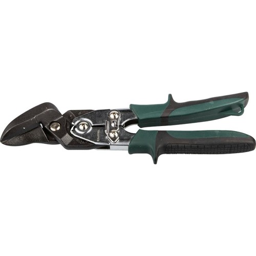 Ножницы по металлу KRAFTOOL 2325-R, применяются для прямой и фигурной резки (в правую сторону) листовых материалов из стали повышенной твердости, нержавеющей стали, цветных металлов. Изготовлены из инструментальной стали. Кованные губки из высококачественной хромомолибденовой стали. Индукционная закалка лезвий до твердости 62 – 65 HRC. Режущие кромки с насечкой предотвращают проскальзывание материала при выполнении реза. Двухрычажная конструкция шарнира увеличивает режущую способность на 40%. Двухкомпонентные рукоятки обеспечивают удобство и надежный захват при работе. Увеличенная нижняя губка позволяет производить резку листа без деформации обрабатываемого материала.
