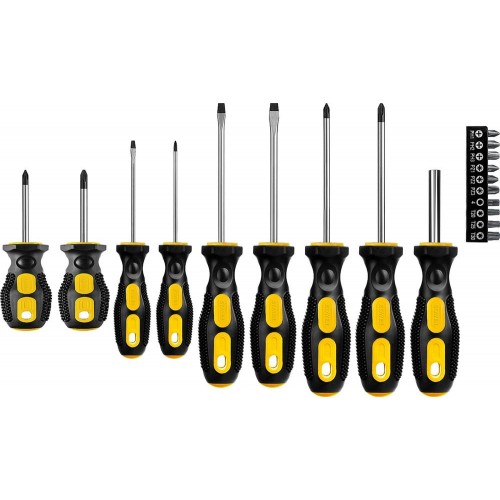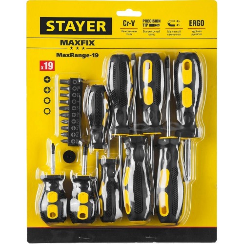 Набор отверток STAYER 2513-H19_z01, предназначен для монтажа и демонтажа резьбовых соединений. Эргономичная двухкомпонентная рукоятка обеспечивает надежный и комфортный захват. Стержень и биты из высококачественной хромванадиевой стали. Оксидированный намагниченный наконечник обеспечивает удобство в работе.