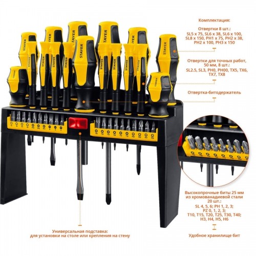 Набор отверток реверсивных STAYER 25312-H37, предназначен для точных работ, в стойке. Специальная стойка-держатель с возможностью установки на стол или подвешивания на стену. Материал стержня и бит - сталь Cr-V. Специально сконструированная двухкомпонентная рукоятка оптимальной формы обеспечивает надежный и комфортный захват. На отвертках имеются лыски для предотвращения скатывания.
