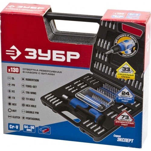 ЗУБР 129 шт., отвертка реверсивная в наборе с битами 25237-H129 Профессионал