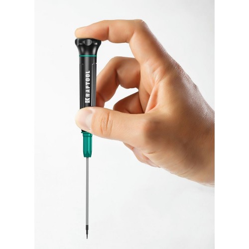 Отвертка для точных работ KRAFTOOL 25681-3.0, предназначена для выполнения прецизионных работ в электронике и электромеханике. Три зоны вращения: быстрая, точная, силовая. Свободно вращающийся затыльник. Высокоточный наконечник.