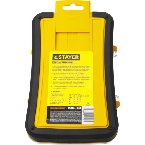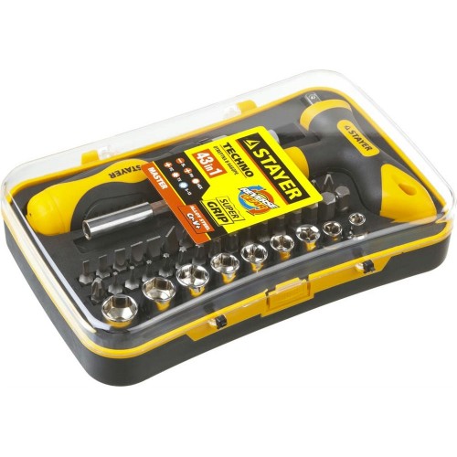 Набор STAYER 25084-H43, предназначен для монтажа и демонтажа резьбовых соединений с применением значительных усилий. Эргономичная двухкомпонентная рукоятка обеспечивает надежный и комфортный захват. Отвертка оснащена реверсивным храповым механизмом. Направление вращения меняется одной рукой. Биты из хромованадиевой стали обладают повышенной прочностью и долговечностью. Торцевые головки из высококачественной углеродистой стали.