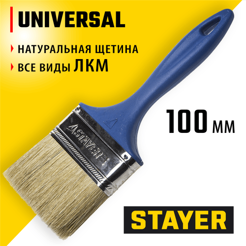 Кисть плоская малярная STAYER 01085-100_z01, предназначена для нанесения всех видов лакокрасочных материалов. Рекомендуются для покрасочных работ большого объема. Натуральная щетина обеспечит оптимальное нанесение различных видов ЛКМ, щетина кисти надежно закреплена бандажом из никелированной стали, а наличие легкой пластмассовой рукоятки обеспечит комфортную работу.