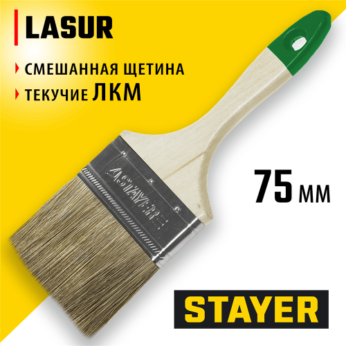 STAYER LASUR, 75 мм, 3", смешанная щетина, деревянная ручка, для высокотекучих ЛКМ, плоская кисть (01031-75)