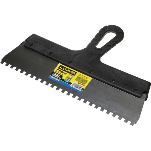 Шпатель зубчатый STAYER 1009-30-06, предназначен для нанесения и выравнивания строительных и клеевых смесей. Благодаря зубчатой кромке шпатель идеально подходит для работы со строительными и клеевыми смесями, полотно из нержавеющей стали обеспечивает надежность и долгий срок службы, а удобная пластмассовая рукоятка создает условия для комфортной работы.