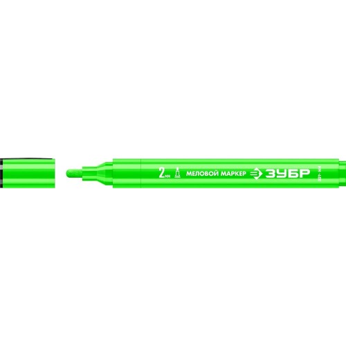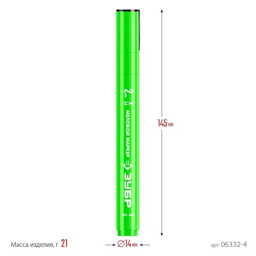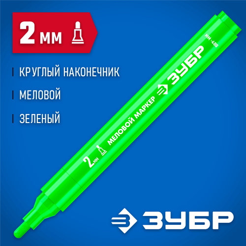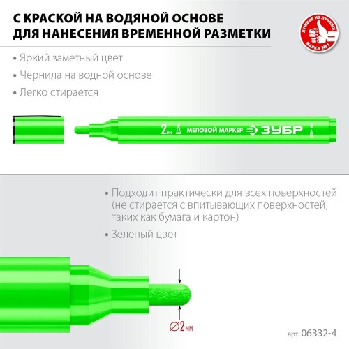 Меловой маркер с жидкой краской на водной основе ЗУБР 06332-4, предназначен для временной маркировки различных поверхностей и изделий из камня, стекла, пластика, дерева, резины, бумаги и картона. Подходит для гладких и слегка шероховатых повехностей, меловых досок, вывесок. Легко стирается, не оставляя следов. Безопасен для человека, т.к. практически не содержит токсических веществ. Яркий заметный цвет.