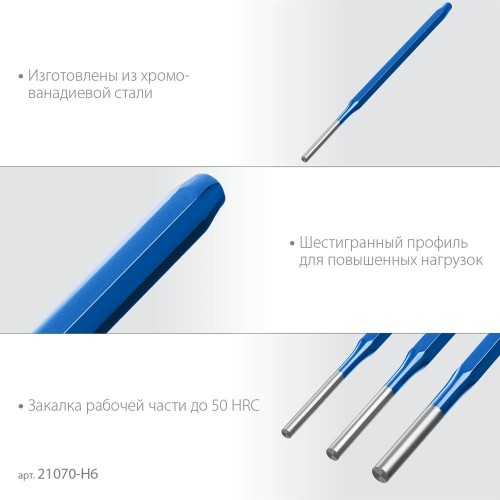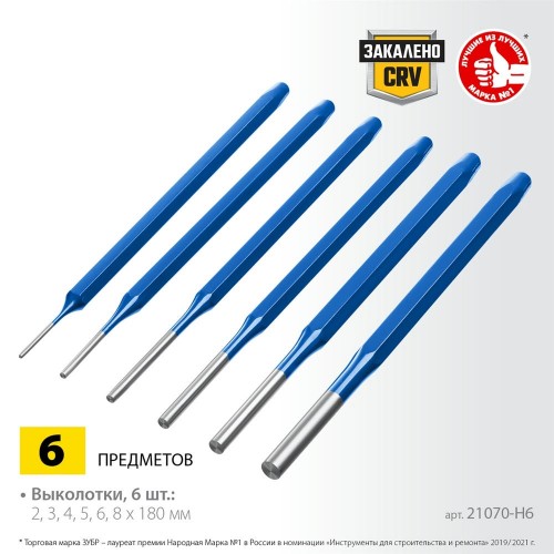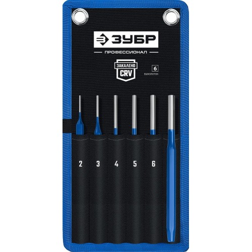 Набор выколоток в чехле ЗУБР 21070-H6, предназначен для проведения ударных операций в области столярно-слесарных работ. Изделие обеспечивает пробивку отверстий, создание мелких насечек и мн. др. в деталях и заготовках из различных материалов.