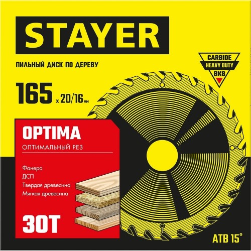 Диск пильный по дереву STAYER OPTIMA 3681-165-20-30_z01, предназначен для продольных и поперечных пропилов твердой и мягкой древесины, фанеры, не ламинированных ДСП, ДВП и МДФ, а также строительного бруса.