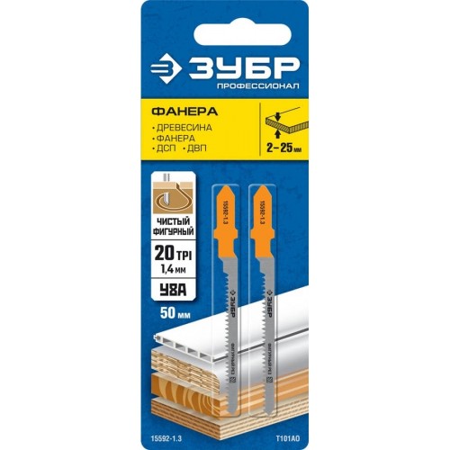 ЗУБР по дереву, фанере, ДСП, ДВП, фигурный рез, EU-хвостовик, шаг 1.4 мм, 50 мм, 2 шт., полотна для эл/лобзика 15592-1.3_z02 Профессионал