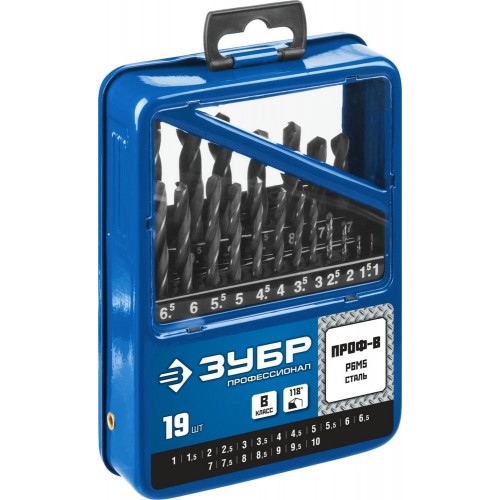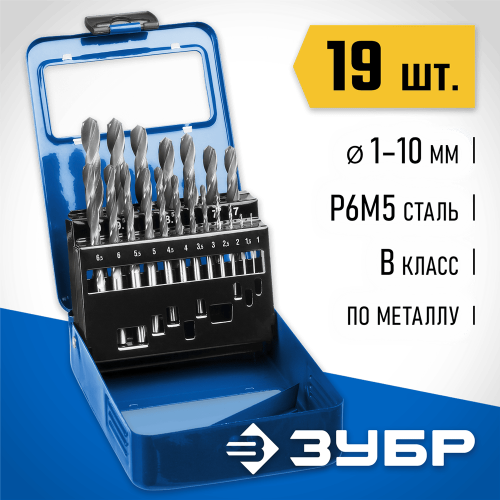 ЗУБР 19 шт. (Ø 1-10 мм), класс В, Р6М5, набор сверл по металлу 29621-H19 Профессионал