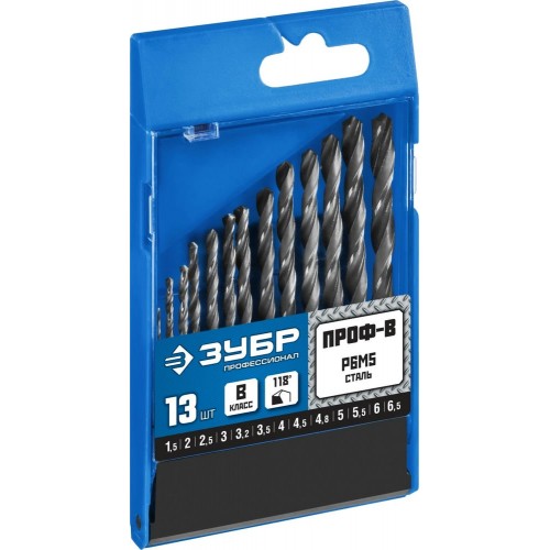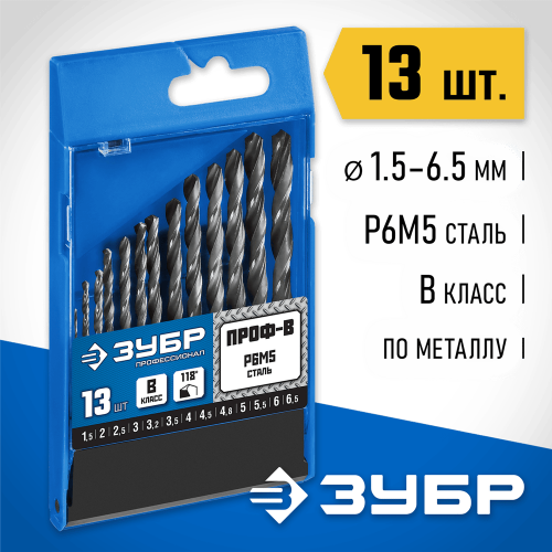 ЗУБР 13 шт. (Ø 1,5-6,5 мм), класс В, Р6М5, набор сверл по металлу 29621-H13 Профессионал