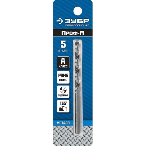 ЗУБР Ø 5 x 86 мм, сталь Р6М5, класс А1, сверло по металлу 29625-5 Профессионал