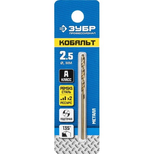ЗУБР Ø 2.5 x 57 мм, сталь Р6М5К5, класс А, сверло по металлу КОБАЛЬТ 29626-2.5 Профессионал