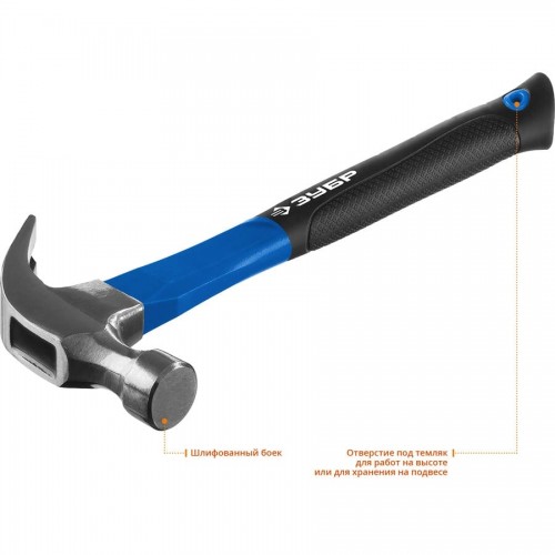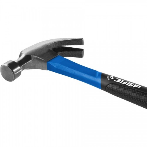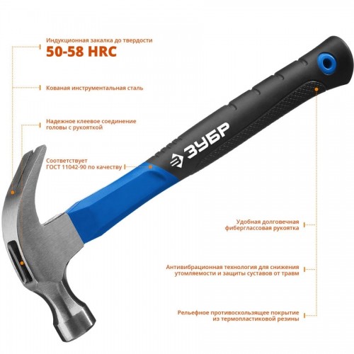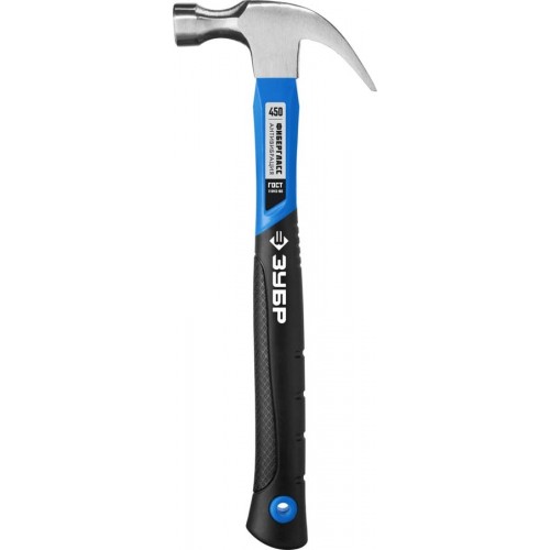 Молоток-гвоздодер ЗУБР 20235-450_z01, предназначен для слесарно-монтажных работ. Антивибрационная технология АВТ. Особопрочное крепление головы. Фиберглассовая рукоятка. Голова из стали 55. Рабочие поверхности головы закалены индукционным методом.