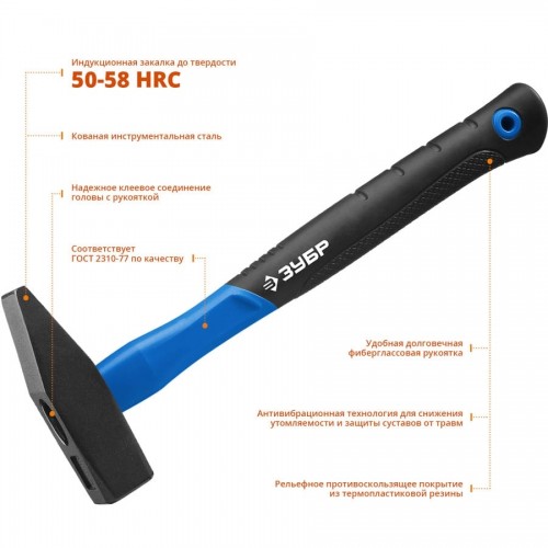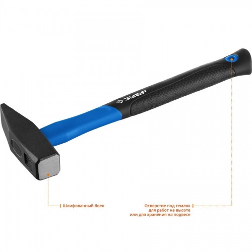 Молоток слесарный ЗУБР 20020-08_z01, предназначен для слесарно-монтажных работ. Двухкомпонентная фиберглассовая рукоятка. Рабочие поверхности головы закалены индукционным методом.