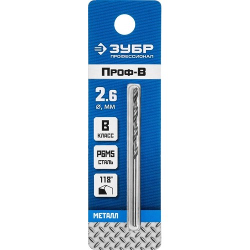 Сверло ЗУБР 29621-2.6, предназначено для обработки легированных и углеродистых сталей с пределом прочности до 900 Н/мм², цветных металлов, серого чугуна и пластмассы. Качественное сверло с высоким ресурсом. Изготовлено методом винтового проката по ГОСТ 10902-77 и соответствует классу точности "В". Угол заточки 118 градусов позволяет обрабатывать легированные и углеродистые стали.