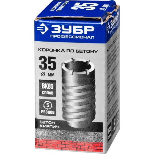 Буровая коронка ЗУБР 29180-35, предназначена для сверления отверстий в бетоне, кирпиче, природном и искусственном камне, а также плотных известняках. Используется с дрелями и перфораторами мощностью не менее 850 Вт в режиме ударного сверления. Твердосплавные зубья из сплава ВК85 позволяют эффективно дробить обрабатываемый материал. Специальная спиралевидная форма корпуса коронки из высокопрочной стали уменьшает трение о стенки отверстия, ускоряет отвод продуктов сверления и повышает срок службы инструмента. Резьбовая посадка М22 обеспечивает надежное крепление коронки с державкой. Износостойкое покрытие защищает от коррозии.