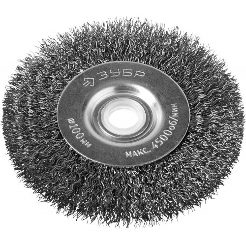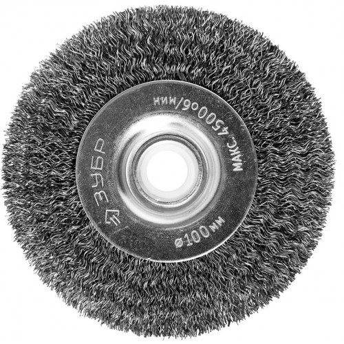 Щетка дисковая для точильно-шлифовального станка ЗУБР 35185-100_z02 Профессионал, для удаления застарелых лакокрасочных покрытий, въевшейся грязи, ржавчины, окалины с поверхностей стальных изделий. Зачистная способность рабочих пучков повышена благодаря специальной технологии тримминга. Износостойкое покрытие защищает от коррозии. Щадящая обработка поверхности без повреждений благодаря витой проволоке. Каждая щетка-крацовка ЗУБР проходит обязательный контроль качества. Все изготавливаемые щетки соответствуют действующим стандартам качества и обеспечивают безопасную работу в четко регламентированном диапазоне оборотов.