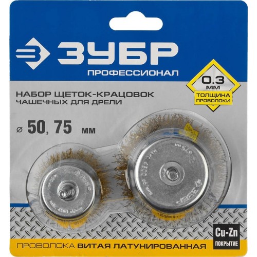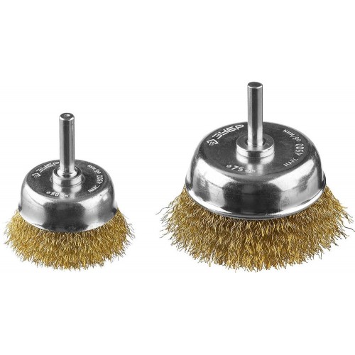 Набор щеток чашечных для дрели ЗУБР 3531-H2_z02, предназначен для удаления застарелых лакокрасочных покрытий, въевшейся грязи, ржавчины, окалины с поверхностей изделий из стали и цветных металлов. Витая стальная латунированная проволока. Латунированное покрытие защищает рабочую часть щетки от коррозии. Каждая щетка-крацовка ЗУБР проходит обязательный контроль качества. Все изготавливаемые щетки соответствуют действующим стандартам качества и обеспечивают безопасную работу в четко регламентированном диапазоне оборотов.