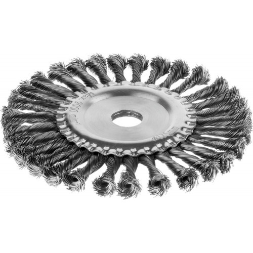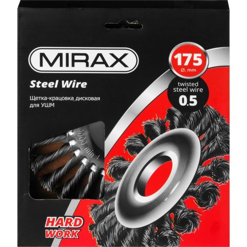 Щетка крацовка дисковая для УШМ MIRAX 35140-175, предназначена для зачистки поверхностей от лакокрасочных покрытий, ржавчины, окалины, различных загрязнений с применением значительных усилий, а также для зачистки сварных швов. Стальная жгутированная проволока. Благодаря еще более высокой жесткости сплетенного пучка и увеличенной толщине проволоки щетка обладает повышенным ресурсом.