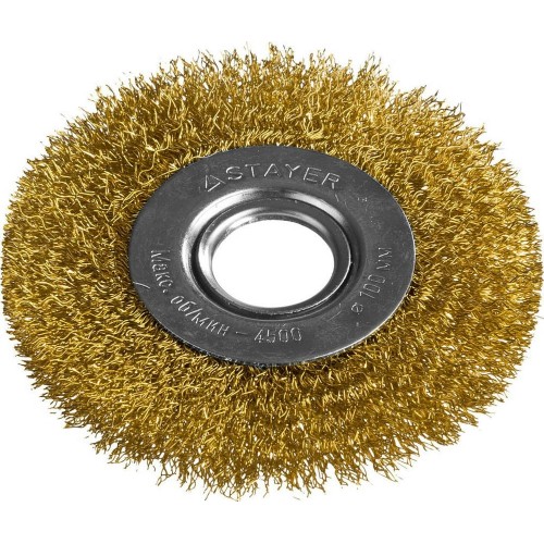 Щетка крацовка дисковая для УШМ STAYER 35122-100, предназначена для зачистки поверхностей от лакокрасочных покрытий, ржавчины, окалины и различных загрязнений с поверхностей изделий из стали и цветных металлов. Щетка изготовлена из латунированной витой проволоки. Латунированное покрытие защищает рабочую часть щетки от коррозии. Витая форма проволоки позволяет обрабатывать поверхности без повреждений.