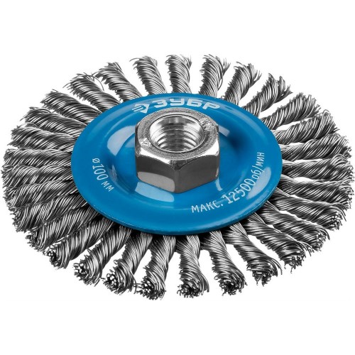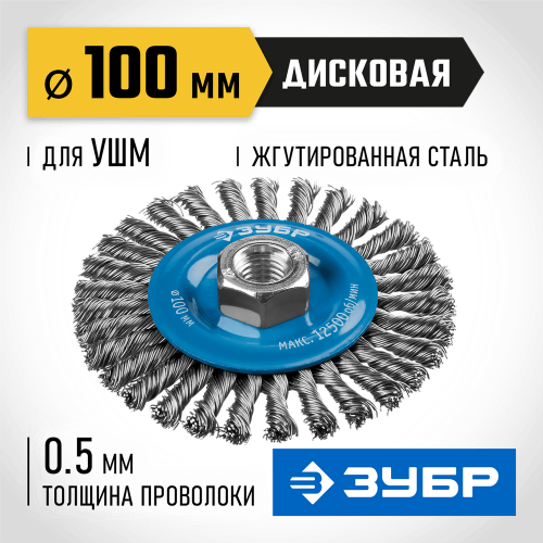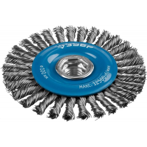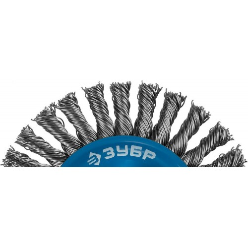 Щетка крацовка дисковая для УШМ ЗУБР 35192-100_z02, предназначена для зачистки поверхностей в труднодоступных местах от лакокрасочных покрытий, ржавчины, окалины, различных загрязнений с применением значительных усилий, а также для зачистки сварных швов. Щетка изготовлена из стальной жгутированной проволоки. Благодаря еще более высокой жесткости сплетенного пучка и увеличенной толщине проволоки щетка обладает повышенным ресурсом.