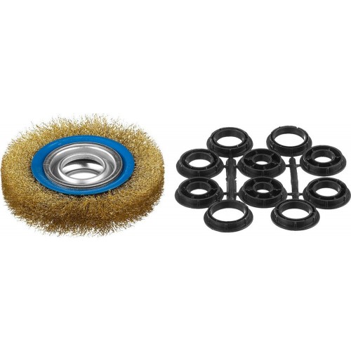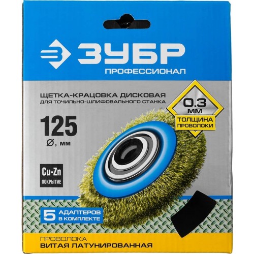 Щетка дисковая для точильно-шлифовального станка 125 мм, ЗУБР 35186-125_z01, для зачистки от лакокрасочных покрытий, ржавчины, окалины и различных загрязнений с поверхностей изделий из стали и цветных металлов. Латунированное покрытие защищает рабочую часть щетки от коррозии. Щадящая обработка поверхности без повреждений благодаря витой проволоке. Зачистная способность рабочих пучков повышена благодаря специальной технологии тримминга.