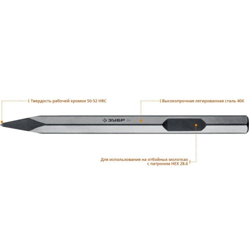 Зубило пикообразное ЗУБР 29380-00-400, предназначено для общих долбежных и демонтажных работ с материалами высокой твердости, такими как кирпичная кладка, бетон или камень. Индуктивная трехступенчатая закалка. Высокопрочная легированная сталь. Высокая прочность по отношению к ударам и динамическим нагрузкам.
