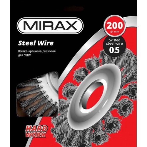Щетка крацовка дисковая для УШМ MIRAX 35140-200, предназначена для зачистки поверхностей от лакокрасочных покрытий, ржавчины, окалины, различных загрязнений с применением значительных усилий, а также для зачистки сварных швов. Стальная жгутированная проволока. Благодаря еще более высокой жесткости сплетенного пучка и увеличенной толщине проволоки щетка обладает повышенным ресурсом.