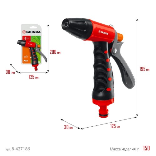 Пистолет поливочный пластиковый с TPR T-R GRINDA 8-427186, предназначен для полива растений при подключении к садовому шлангу. Плавная регулировка от сильной струи до распыления позволяет выполнять полив в широком диапазоне режимов, при этом хорошо подходит для любых работ по мойке и очистке. Мягкое TPR-покрытие гарантирует надёжный и удобный хват. Курок, расположенный сзади рукоятки, оборудован фиксатором для непрерывной подачи воды, что обеспечивает комфорт в эксплуатации пистолета.