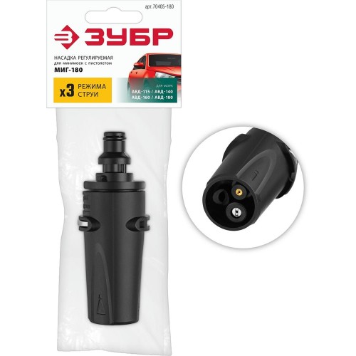 Насадка регулируемая ЗУБР 70405-180, предназначена для эффективной очистки поверхностей от загрязнений путем подачи струи высокого давления. Полная совместимость с пистолетом ЗУБР МИГ-180 70410-180. 3 сменные струи с разными характеристиками. Смена струи простым поворотом корпуса. Быстросъемное соединение. Подходит для моек АВД-115, АВД-140, АВД-160, АВД-180.