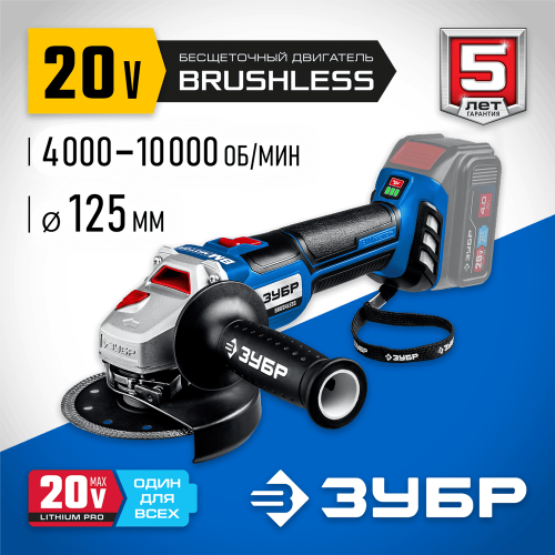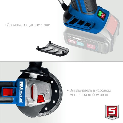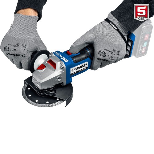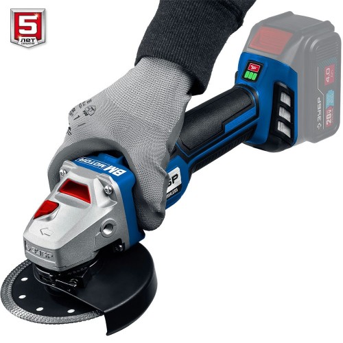 Угловая шлифмашина ЗУБР AB-125, предназначена для зачистки, шлифовки и резки металлов, обработки бетона и камня при установке соответствующих шлифовальных, отрезных, алмазных кругов. Бесщеточный двигатель Brushless обладает целым рядом преимуществ по сравнению с обычным щеточным двигателем: высокий крутящий момент (в 2 раза выше, чем у аналогичного щеточного двигателя), высокий КПД благодаря максимально эффективному преобразованию электромагнитной энергии в механическую (ввиду отсутствия перекоммутаций), низкое энергопотребление, вследствие чего изделие работает до 4 раз дольше на одном заряде батареи, высокая степень защиты двигателя благодаря интеллектуальному управлению, контроллер двигателя позволяет гибко регулировать крутящий момент и поддерживать его на максимальном уровне в широком диапазоне оборотов, отсутствие нагрева и потерь из-за переходных сопротивлений, повышенная надежность ввиду отсутствия искрения, трения и контактирующих деталей.
