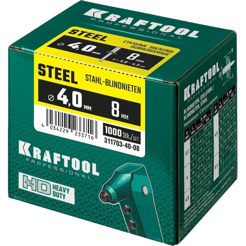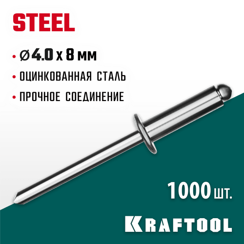 Заклепки стальные KRAFTOOL 311703-40-08, предназначены для получения неразъемного соединения из двух или более слоев материалов с помощью заклепочника.