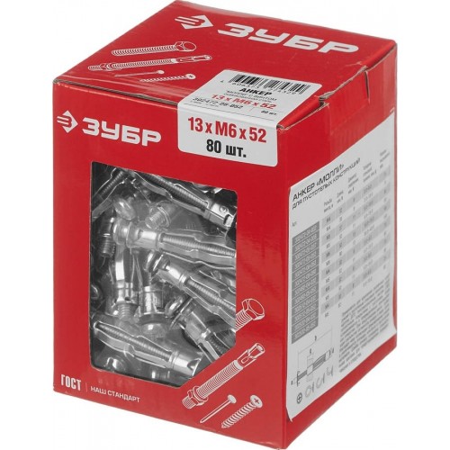 ЗУБР 80 шт., М6х52х13 мм, оцинкованный, анкер МОЛЛИ для пустотелых конструкций 302472-06-052