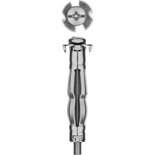 Анкер для пустотелых материалов ЗУБР 302472-06-052, предназначен для крепления различных конструкций к пустотелым стеновым панелям, гипсокартону, ДСП, гипсоволоконным листам (ГВЛ), потолочным покрытиям с пустотами. Анкер устанавливается в предварительно просверленное и очищенное от буровой муки отверстие.