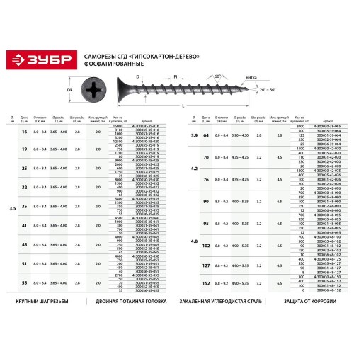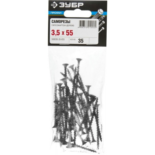 Саморезы гипсокартон-дерево ЗУБР 300036-35-055, предназначены для крепления гипсокартона к деревянной обрешетке, не допуская крошение волокнистой структуры дерева. Саморезы легко вкручиваются обычным шуруповертом или отверткой с крестообразным шлицем PH2 (DIN). Предварительное сверление в скрепляемых материалах не требуется. Фосфатированное покрытие обеспечивает защиту от коррозии. Широко применяются при выполнении бытового ремонта, сборке и установке различных конструкций. Саморезы для гипсокартона изготовлены из стального прутка с высоким содержанием углерода. Контроль геометрией самореза начинается с калибровки прутка и заканчивается тщательной проверкой размеров готового изделия. Нормативная твердость стали достигается термической обработкой. Поверхностная твердость 450-720HV, твердость в сердцевине 290-450HV.